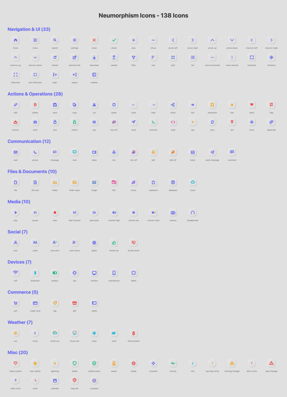 100+ neumorphism-style SVG icons with soft shadow effects. Includes navigation, actions, communication, media, and more. Clean vectors, easy to customize, perfect for modern UI projects.